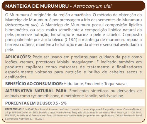 A Manteiga de Murumuru possui composição lipídica biomimética, ou seja, muito semelhante a composição lipídica natural da pele, promove nutrição, hidratação e maciez à pele e cabelos.