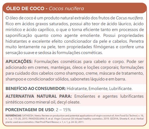 O Óleo de Coco é um produto natural extraído dos frutos de Cocus nucifera. Rico em ácidos graxos saturados, possui alto teor de ácido láurico, ácido mirístico e ácido caprílico, o que o torna eficiente tanto em processos de saponificação quanto como agente emoliente. Possui propriedades hidratantes e excelente efeito condicionador da pele e cabelos. Penetra muito lentamente na pele, tem propriedades filmógenas e confere uma sensação suave e sedosa às formulações cosméticas.