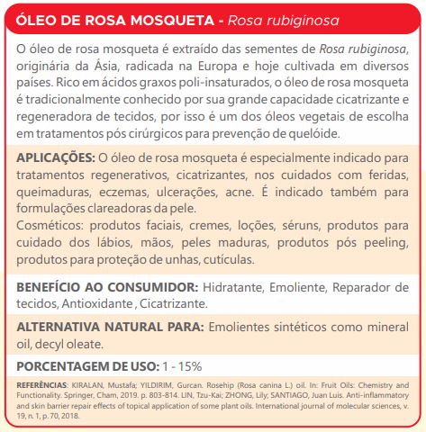 APLICAÇÕES: O óleo de rosa mosqueta é especialmente indicado para tratamentos regenerativos, cicatrizantes, nos cuidados com feridas, queimaduras, eczemas, ulcerações, acne. É indicado também para formulações clareadoras da pele. Cosméticos: produtos faciais, cremes, loções, séruns, produtos para cuidado dos lábios, mãos, peles maduras, produtos pós peeling, produtos para proteção de unhas, cutículas.